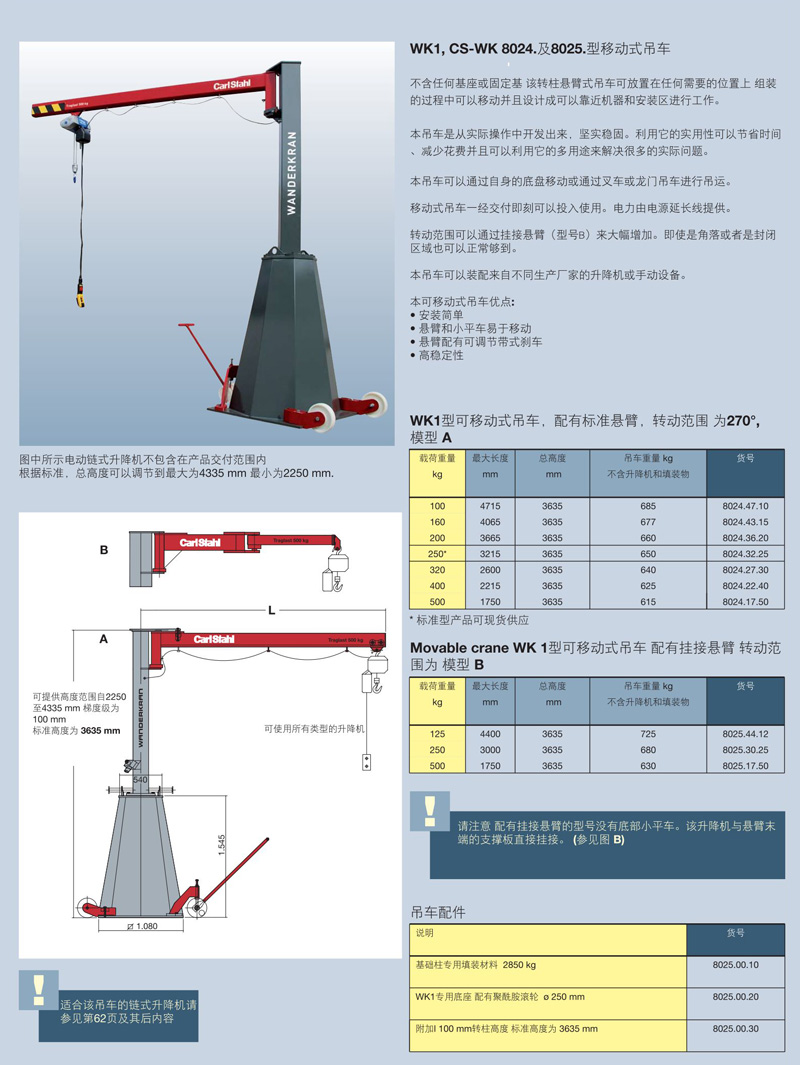 卡爾施達移動式吊車WK1, CS-WK 8024.及8025.型不含任何基座或固定基 該轉柱懸臂式吊車可放置在任何需要的位置上 組裝的過程中可以移動并且設計成可以靠近機器和安裝區(qū)進行工作。