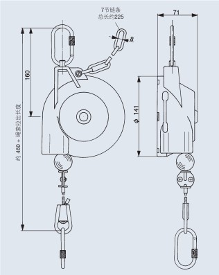 繩索:卷繩筒高強度鋼繩,帶彈性繩索縮回限制裝置和用來吊掛物體的螺旋彈簧保險鉤。繩索長度可通過一個繩鎖進行無級調(diào)節(jié)。通過一個繩夾可無級縮短工作行程。
