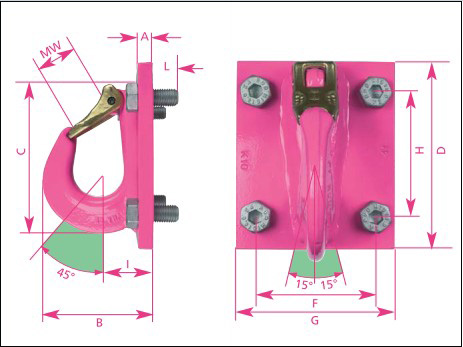 螺栓型吊鉤一般在吊架或分布梁上作為吊裝點(diǎn)使用,與鋼絲繩索具、環(huán)形吊帶及其它橢圓形的吊環(huán)或吊孔連接。