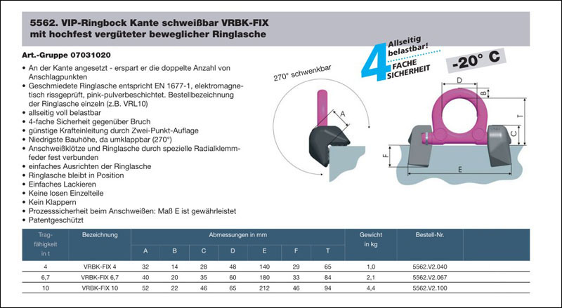 德國路德RUD焊接型吊環(huán) VRBK用于棱邊,配有移動式高強度回火吊環(huán)鍛制吊環(huán),符合DIN EN 1677-1,其產(chǎn)品特點如下: