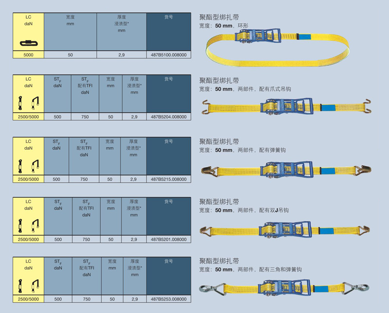 配有TFI,符合 DIN EN 12195-2,浸漬加固型*,寬度為50 mm,標(biāo)準(zhǔn)長度為 8 m,固定端為0,5 m強(qiáng)力型且符合人體工學(xué)栓緊過程安全且釋放過程受控