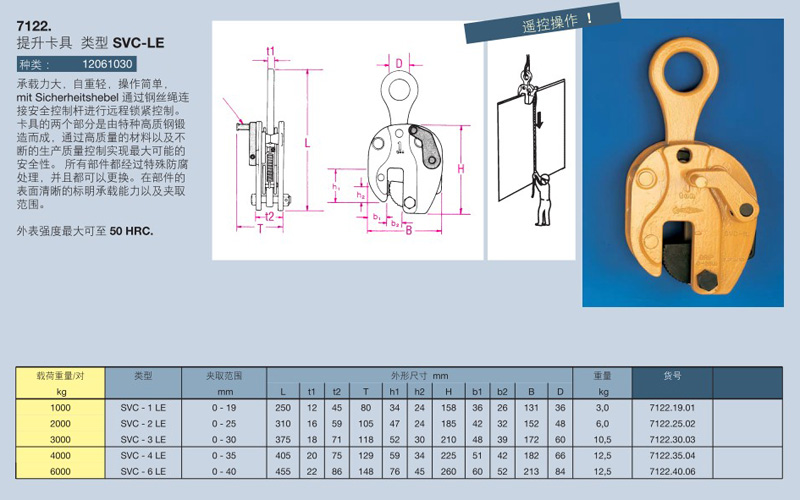 承載力大,自重輕,操作簡單,mit Sicherheitshebel 通過鋼絲繩連接安全控制桿進(jìn)行遠(yuǎn)程鎖緊控制。卡具的兩個(gè)部分是由特種高質(zhì)鋼鍛造而成,通過高質(zhì)量的材料以及不斷的生產(chǎn)質(zhì)量控制實(shí)現(xiàn)更大可能的安全性。 所有部件都經(jīng)過特殊防腐處理,并且都可以更換。在部件的表面清晰的標(biāo)明承載能力以及夾取范圍。外表強(qiáng)度可50HRC.