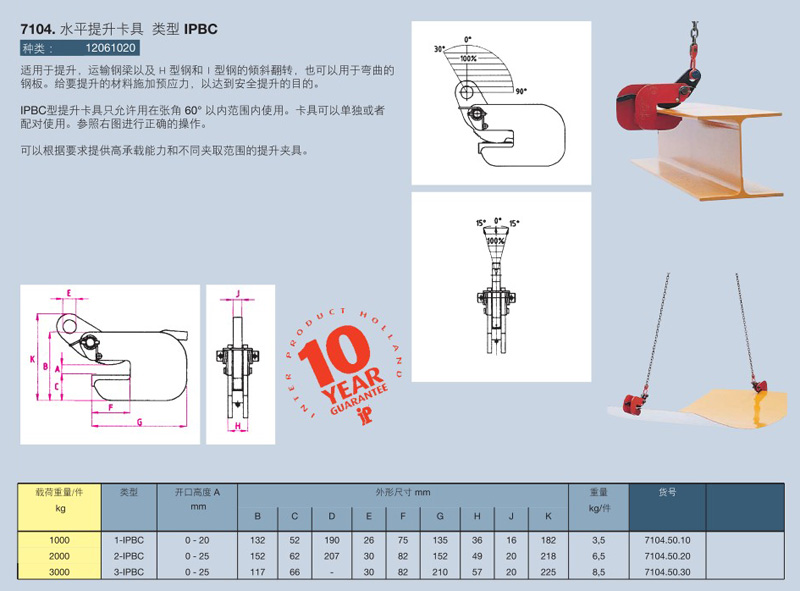 適用于提升,運輸鋼梁以及 H 型鋼和 I 型鋼的傾斜翻轉(zhuǎn),也可以用于彎曲的鋼板。給要提升的材料施加預應力,以達到安全提升的目的。IPBC型提升卡具只允許用在張角 60° 以內(nèi)范圍內(nèi)使用。卡具可以單獨或者配對使用。參照右圖進行正確的操作?梢愿鶕(jù)要求提供高承載能力和不同夾取范圍的提升夾具。