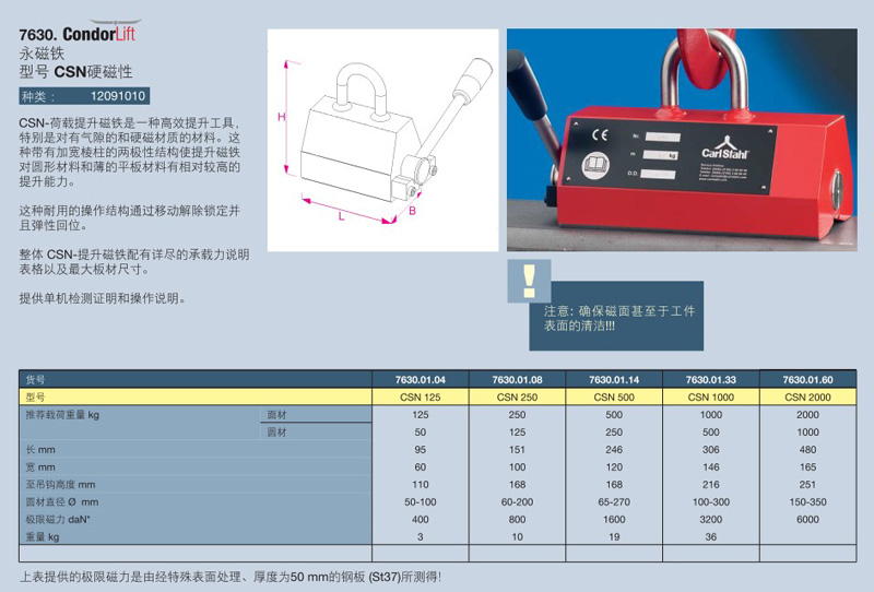 CSN-荷載提升磁鐵是一種高效提升工具,特別是對(duì)有氣隙的和硬磁材質(zhì)的材料。這種帶有加寬棱柱的兩極性結(jié)構(gòu)使提升磁鐵對(duì)圓形材料和薄的平板材料有相對(duì)較高的提升能力。這種耐用的操作結(jié)構(gòu)通過(guò)移動(dòng)解除鎖定并且彈性回位。整體 CSN-提升磁鐵配有詳盡的承載力說(shuō)明表格以及最大板材尺寸。提供單機(jī)檢測(cè)證明和操作說(shuō)明。