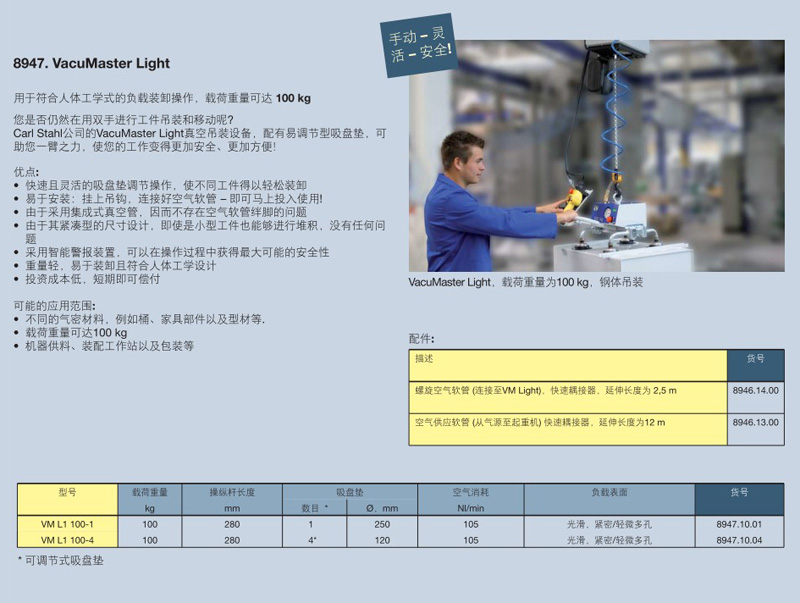 Carl Stahl公司的VacuMaster Light真空吊裝設(shè)備,配有易調(diào)節(jié)型吸盤墊,可助您一臂之力,使您的工作變得更加安全、更加方便!