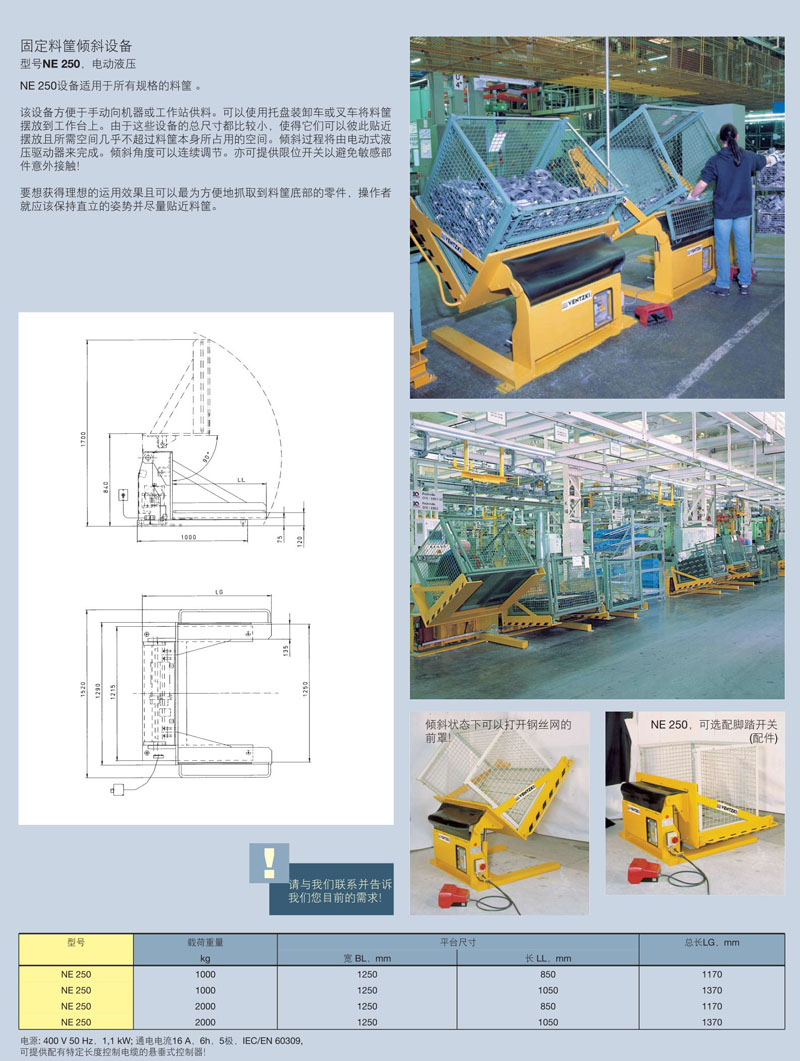 該設(shè)備方便于手動(dòng)向機(jī)器或工作站供料?梢允褂猛斜P裝卸車或叉車將料筐擺放到工作臺(tái)上。由于這些設(shè)備的總尺寸都比較小,使得它們可以彼此貼近擺放且所需空間幾乎不超過料筐本身所占用的空間。傾斜過程將由電動(dòng)式液壓驅(qū)動(dòng)器來完成。傾斜角度可以連續(xù)調(diào)節(jié)。亦可提供限位開關(guān)以避免敏感部件意外接觸!要想獲得較好的運(yùn)用效果且可以最為方便地抓取到料筐底部的零件,操作者就應(yīng)該保持直立的姿勢(shì)并盡量貼近料筐。