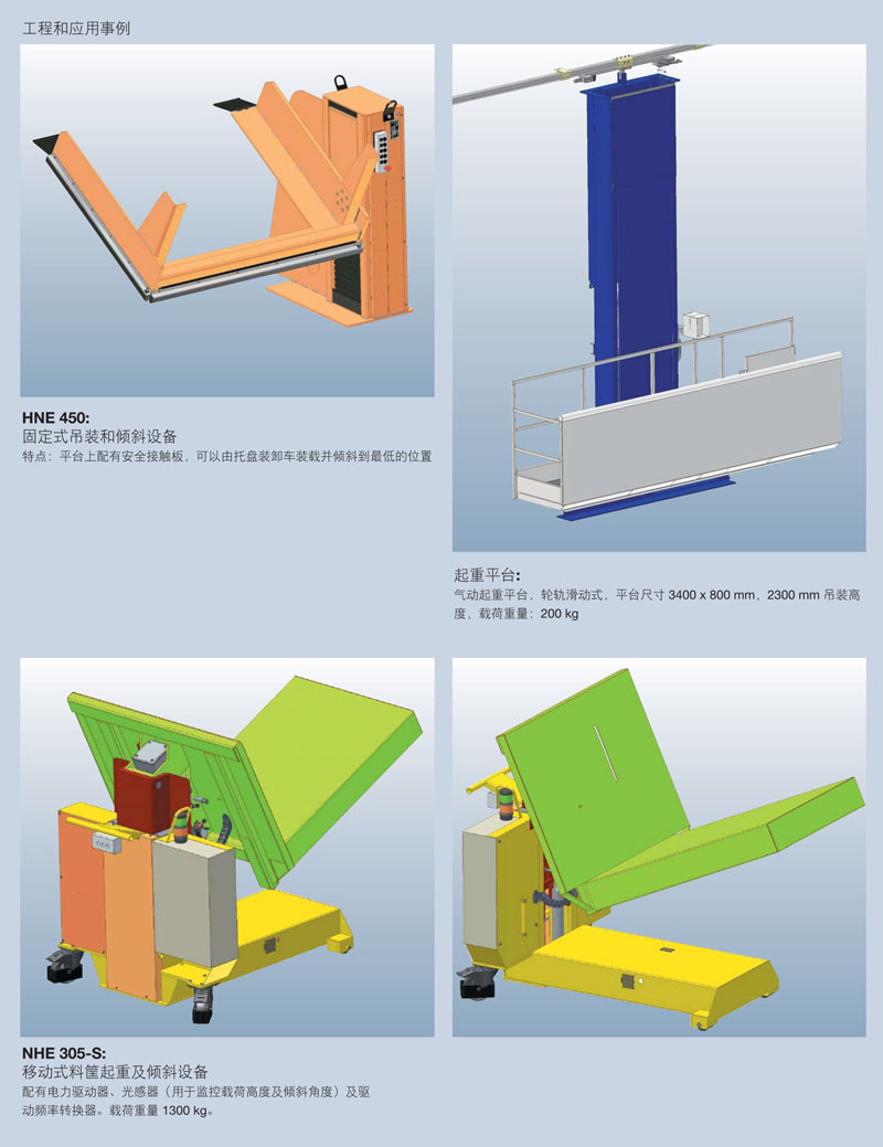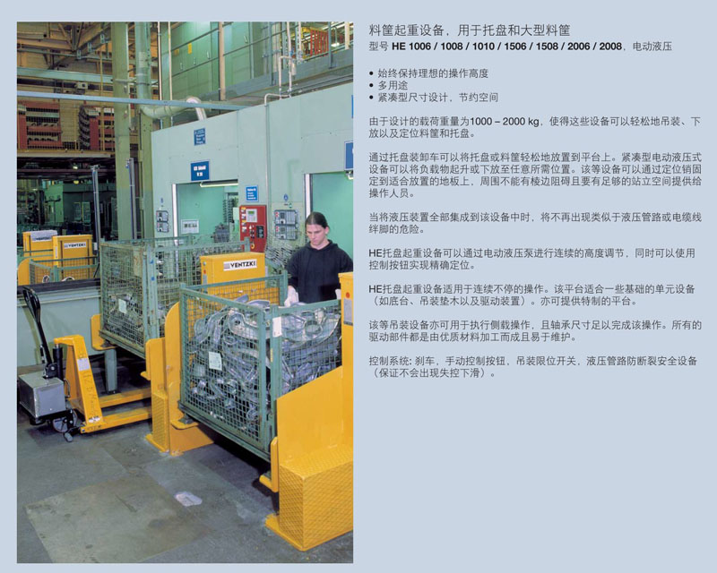 由于設(shè)計的載荷重量為1000 – 2000 kg,使得這些設(shè)備可以輕松地吊裝、下放以及定位料筐和托盤。通過托盤裝卸車可以將托盤或料筐輕松地放置到平臺上。緊湊型電動液壓式設(shè)備可以將負載物起升或下放至任意所需位置。該等設(shè)備可以通過定位銷固定到適合放置的地板上,周圍不能有棱邊阻礙且要有足夠的站立空間提供給