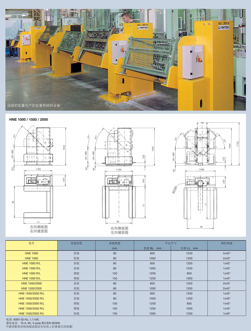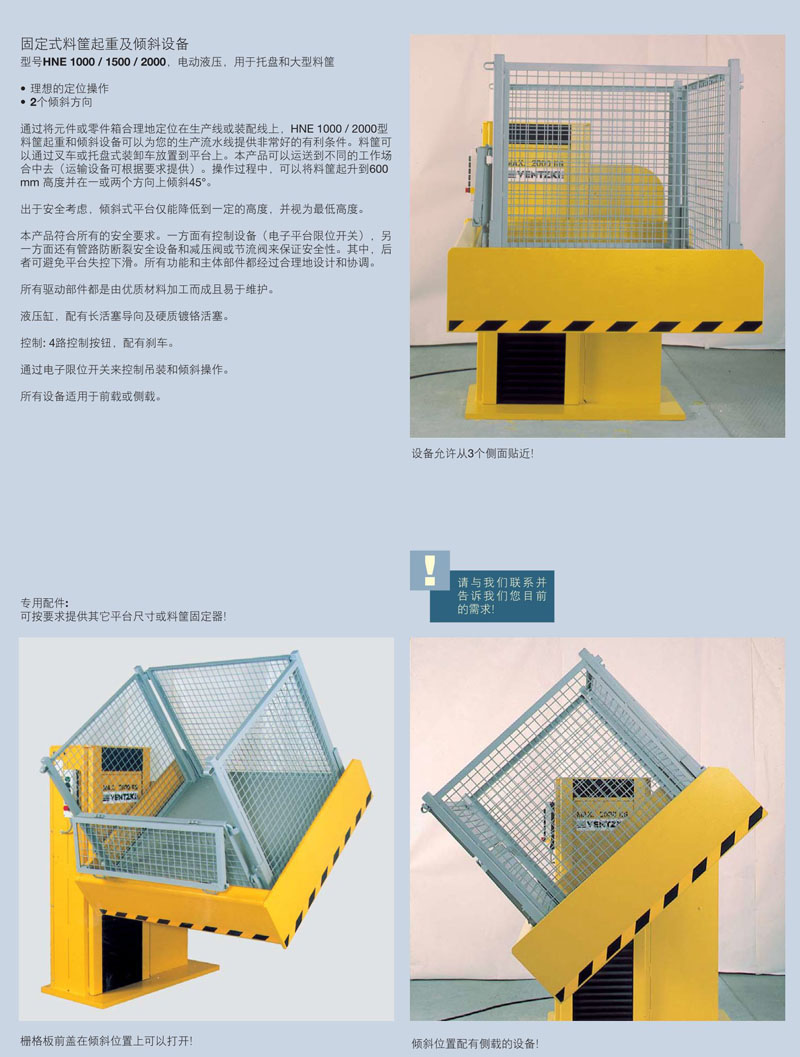 通過將元件或零件箱合理地定位在生產(chǎn)線或裝配線上,HNE 1000 / 2000型料筐起重和傾斜設(shè)備可以為您的生產(chǎn)流水線提供非常好的有利條件。料筐可以通過叉車或托盤式裝卸車放置到平臺(tái)上。本產(chǎn)品可以運(yùn)送到不同的工作場(chǎng)合中去(運(yùn)輸設(shè)備可根據(jù)要求提供)。操作過程中,可以將料筐起升到600mm 高度并在一或兩個(gè)方向上傾斜45°。出于安全考慮,傾斜式平臺(tái)僅能降低到一定的高度,并視為最低高度。本產(chǎn)品符合所有的安全要求。一方面有控制設(shè)備(電子平臺(tái)限位開關(guān)),另一方面還有管路防斷裂安全設(shè)備和減壓閥或節(jié)流閥來保證安全性。其中,后者可避免平臺(tái)失控下滑。所有功能和主體部件都經(jīng)過合理地設(shè)計(jì)和協(xié)調(diào)。所有驅(qū)動(dòng)部件都是由優(yōu)質(zhì)材料加工而成且易于維護(hù)。液壓缸,配有長(zhǎng)活塞導(dǎo)向及硬質(zhì)鍍鉻活塞?刂: 4路控制按鈕,配有剎車。通過電子限位開關(guān)來控制吊裝和傾斜操作。所有設(shè)備適用于前載或側(cè)載。