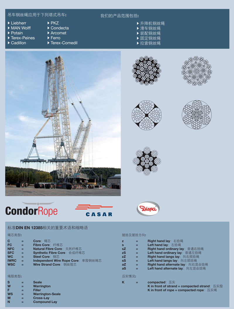 應用: 臂架鋼繩和吊桿鋼繩,用于移動式吊車及抓斗。升降機鋼繩,用于貨柜吊車、浮吊、碼頭吊及龍門吊等,適于多繩操作以及較小的吊裝高度。具有右捻和左捻2根繩的產品可用于較高的吊裝高度。固定鋼絲繩和閉合鋼絲繩則用于抓斗。