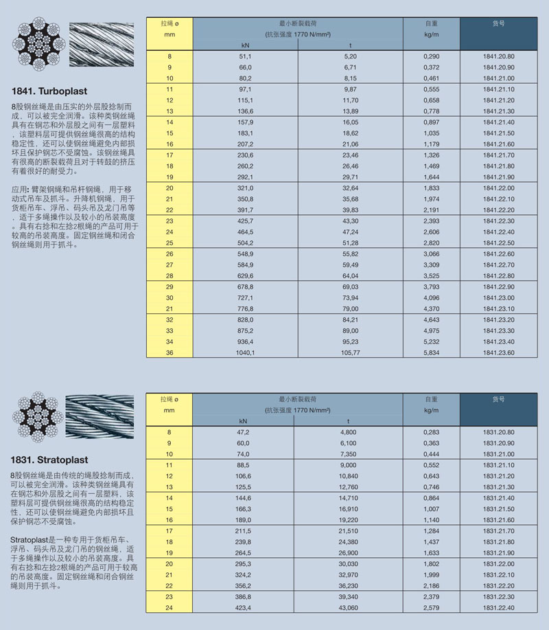 塑料層可提供鋼絲繩很高的結構穩(wěn)定性,還可以使鋼絲繩避免內部損壞且保護鋼芯不受腐蝕。Stratoplast是一種專用于貨柜吊車、浮吊、碼頭吊及龍門吊的鋼絲繩,適于多繩操作以及較小的吊裝高度。具有右捻和左捻2根繩的產品可用于較高的吊裝高度。固定鋼絲繩和閉合鋼絲繩則用于抓斗。
