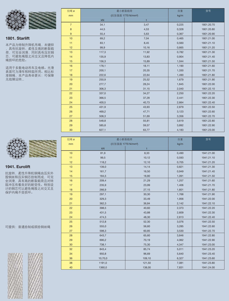 本產(chǎn)品為特制升降機(jī)吊繩,未鍍鋅,具有抗旋轉(zhuǎn)、柔性及高的斷裂載荷,可完全潤滑,同時(shí)具有壓實(shí)鋼芯,可避免繩股之間交叉且降低內(nèi)繩損壞的危險(xiǎn)。適用于多數(shù)電動(dòng)吊車及電梯。光滑表面可為滑車和轉(zhuǎn)鼓所用。相比標(biāo)準(zhǔn)鋼繩,本產(chǎn)品壽命更長:可保障無故障運(yùn)轉(zhuǎn)...