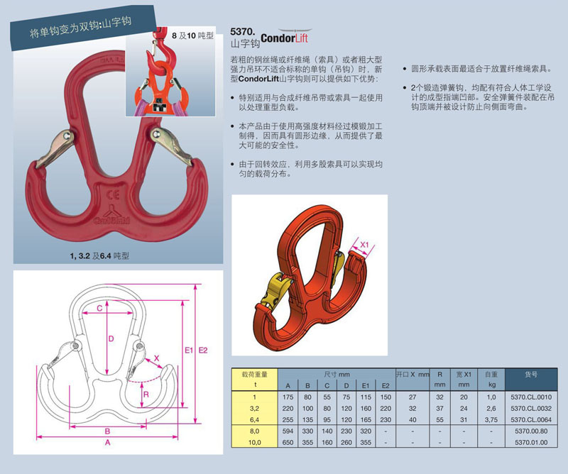若粗的鋼絲繩或纖維繩(索具)或者粗大型強(qiáng)力吊環(huán)不適合標(biāo)稱的單鉤(吊鉤)時(shí),新型CondorLift山字鉤則可以提供如下優(yōu)勢:
