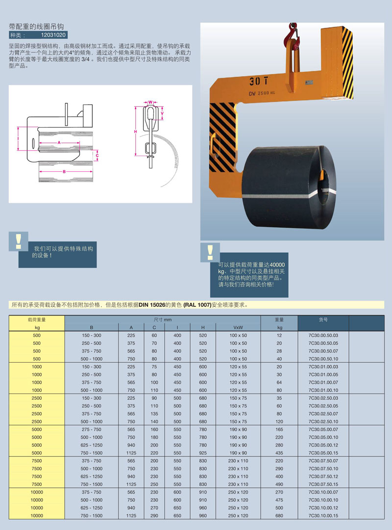 堅(jiān)固的焊接型鋼結(jié)構(gòu),由高級(jí)鋼材加工而成。通過(guò)采用配重,使吊鉤的承載力臂產(chǎn)生一個(gè)向上的大約4°的傾角,通過(guò)這個(gè)傾角來(lái)阻止貨物滑動(dòng)。 承載力臂的長(zhǎng)度等于最大線圈寬度的 3/4 。我們也提供中型尺寸及特殊結(jié)構(gòu)的同類