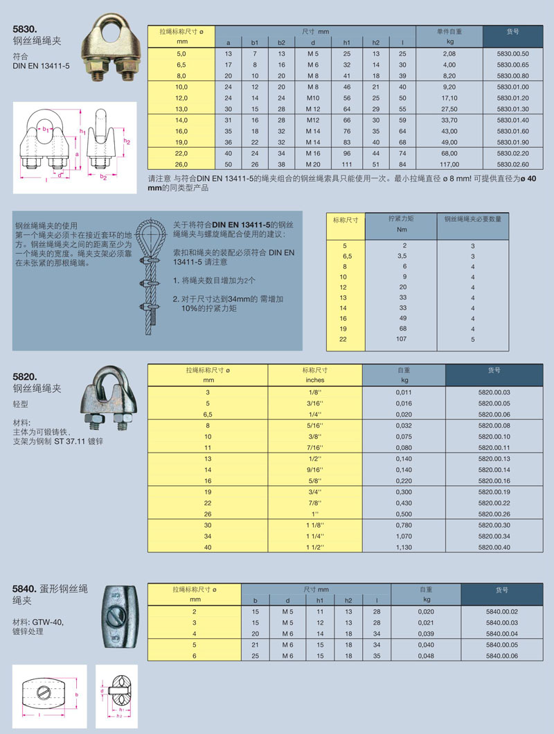 第一個繩夾必須卡在接近套環(huán)的地方。鋼絲繩繩夾之間的距離至少為一個繩夾的寬度。繩夾支架必須靠在未張緊的那根繩端。關于將符合DIN EN 13411-5的鋼絲