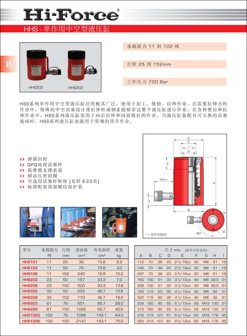 HSS系列單作用中空型液壓缸應用極其廣泛,使用于加工、維修、拉伸作業(yè)。在需要拉伸力的作業(yè)中,特殊的中空活塞設計使拉伸桿或鋼索能夠穿過整個液壓缸進行作業(yè)。在各種推拉和拉伸作業(yè)中,HSS系列液壓缸常用于向后拉伸和向前推拉的作業(yè)。當液壓缸裝配有可互換的活塞底座時,HSS系列液壓缸也能用于常規(guī)的頂升作業(yè)。