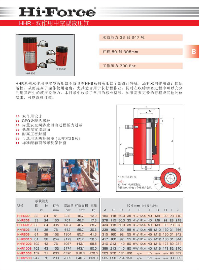 HHR系列雙作用中空型液壓缸不僅具有HHS系列液壓缸全部設計特征,還有雙向作用設計的優(yōu)越性。從而提高了操作使用速度,尤其適合用于長行程作業(yè)。同時在收縮活塞過程中可以充分利用其產(chǎn)生的液壓拉伸力。本目錄中收錄了常用的標準型號。如果需要更長的行程或其他噸位要求,可以選擇訂做。