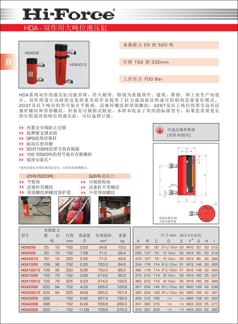 HDA系列雙作用液壓缸功能多樣,經(jīng)久耐用。特別為重載頂升、建筑、維修、和工業(yè)生產(chǎn)而設計。雙作用設計為持續(xù)反復的重負荷作業(yè)提供了拉力強勁而且快速可控制的活塞復位模式。203T及以下噸位的型號裝有平鞍座,活塞桿螺紋和頂部螺紋,326T及以上噸位的型號沒有活塞桿螺紋和頂部螺紋,但裝有可傾斜式鞍座。本樣本收錄了常用的標準型號,如果您需要更長的行程或其他噸位的液壓缸,可以選擇訂做。