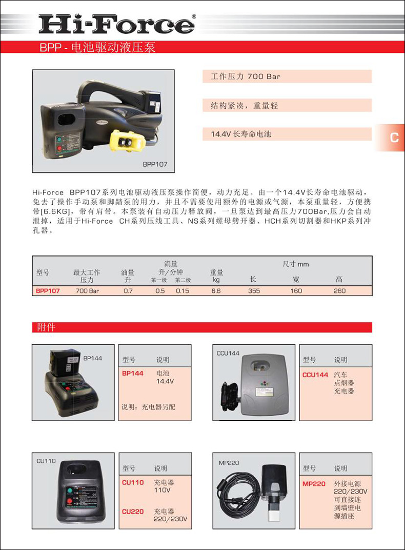 Hi-Force BPP107系列電池驅(qū)動液壓泵操作簡便,動力充足。由一個14.4V長壽命電池驅(qū)動,免去了操作手動泵和腳踏泵的用力,并且不需要使用額外的電源或氣源,本泵重量輕,方便攜帶[6.6KG],帶有肩帶。本泵裝有自動壓力釋放閥,一旦泵達到壓力700Bar, 壓力會自動泄掉,適用于Hi-Force CH系列壓線工具、NS系列螺母劈開器、HCH系列切割器和HKP系列沖孔器。