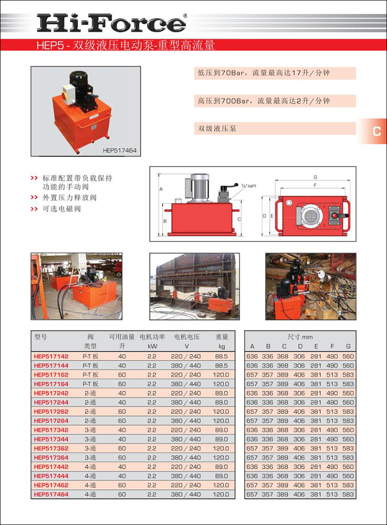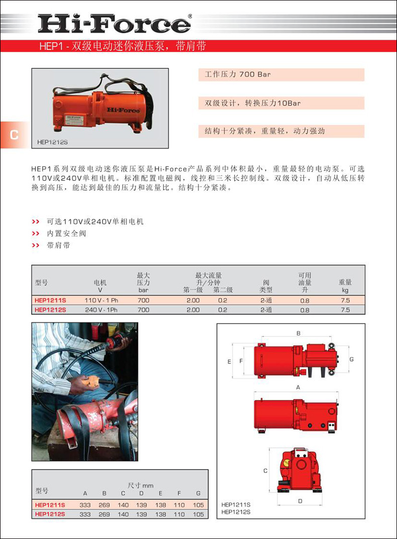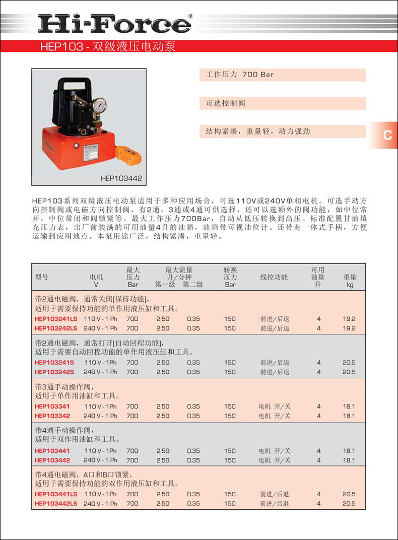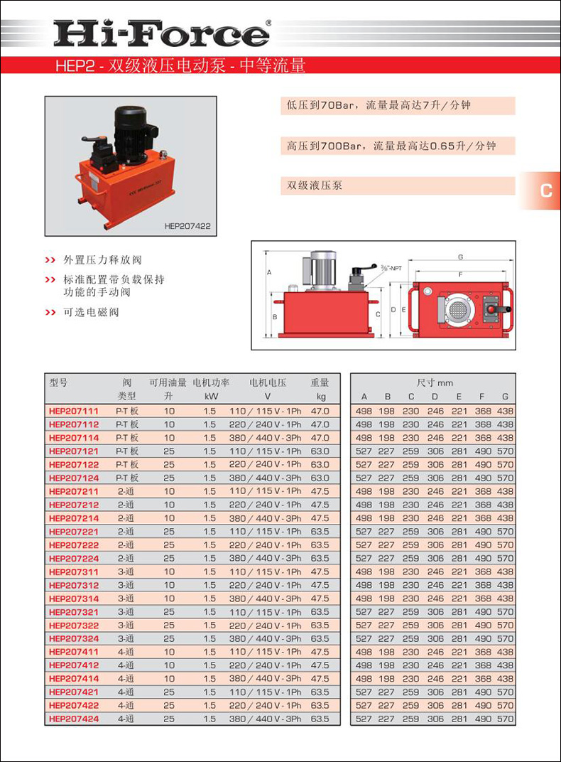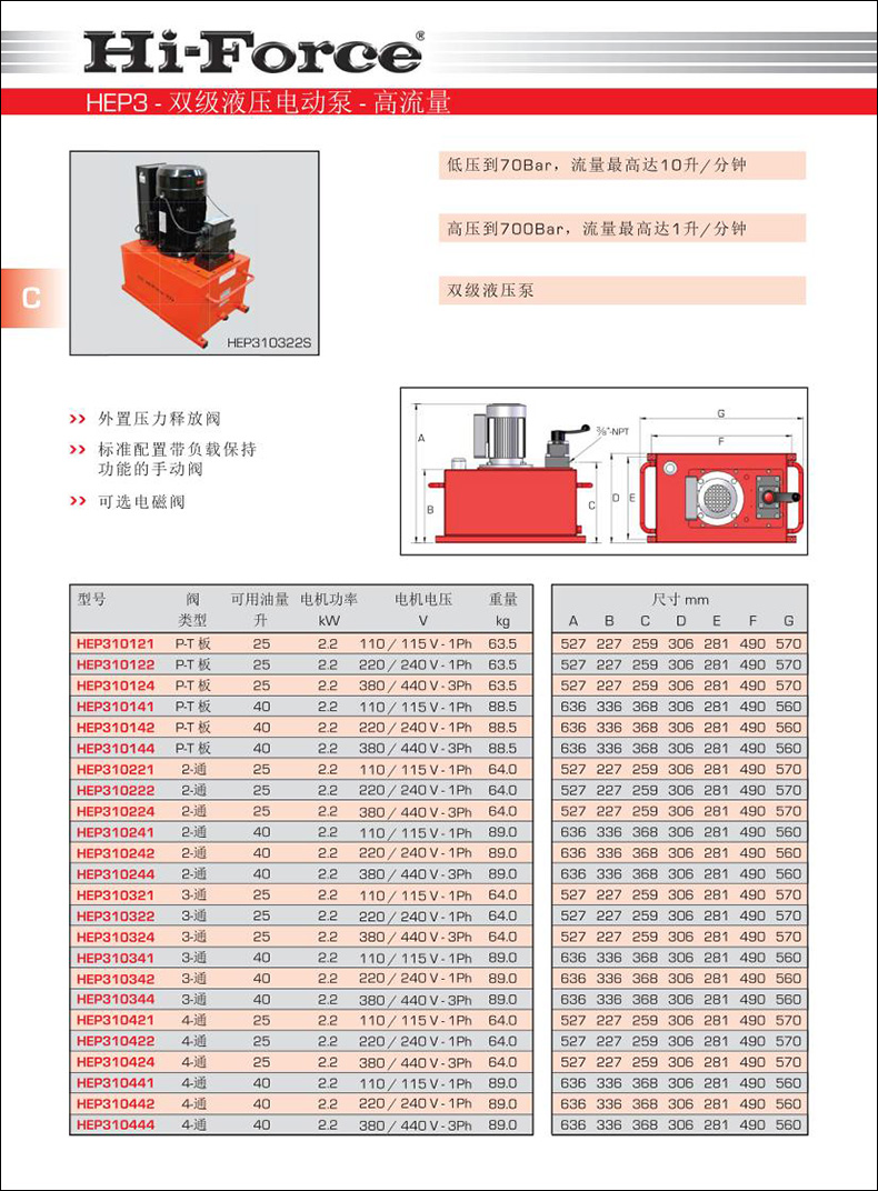 H E P 1 系列雙級電動迷你液壓泵是H i - F o r c e 產(chǎn)品系列中體積小款式,重量輕的電動泵?蛇x1 1 0 V 或2 4 0 V 單相電機。標準配置電磁閥,線控和三米長控制線。雙級設計,自動從低壓轉(zhuǎn)換到高壓,能達到最佳的壓力和流量比。結(jié)構(gòu)十分緊湊。
