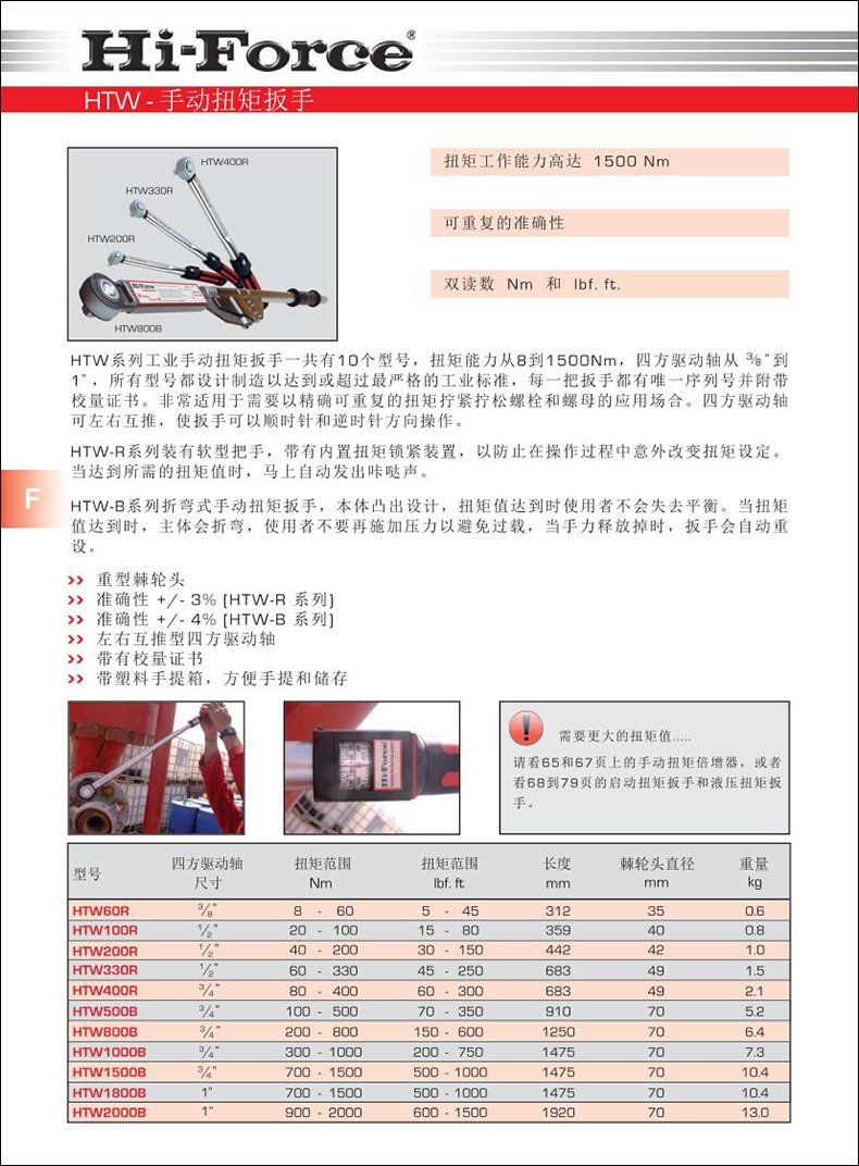 HTW系列工業(yè)手動(dòng)扭矩扳手一共有10個(gè)型號(hào),扭矩能力從8到1500Nm,四方驅(qū)動(dòng)軸從 到1 ,所有型號(hào)都設(shè)計(jì)制造以達(dá)到或超過最嚴(yán)格的工業(yè)標(biāo)準(zhǔn),每一把扳手都有唯一序列號(hào)并附帶校量證書。非常適用于需要以精確可重復(fù)的扭矩?cái)Q緊擰松螺栓和螺母的應(yīng)用場(chǎng)合。四方驅(qū)動(dòng)軸可左右互推,使扳手可以順時(shí)針和逆時(shí)針方向操作。