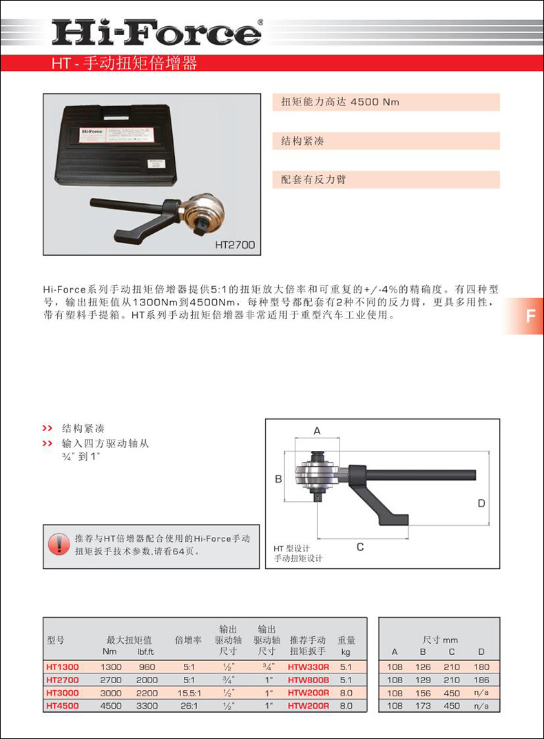 Hi-Force系列手動(dòng)扭矩倍增器提供5:1的扭矩放大倍率和可重復(fù)的+/-4%的精確度。有四種型號(hào),輸出扭矩值從1300Nm到4500Nm,每種型號(hào)都配套有2種不同的反力臂,更具多用性,帶有塑料手提箱。HT系列手動(dòng)扭矩倍增器非常適用于重型汽車工業(yè)使用。