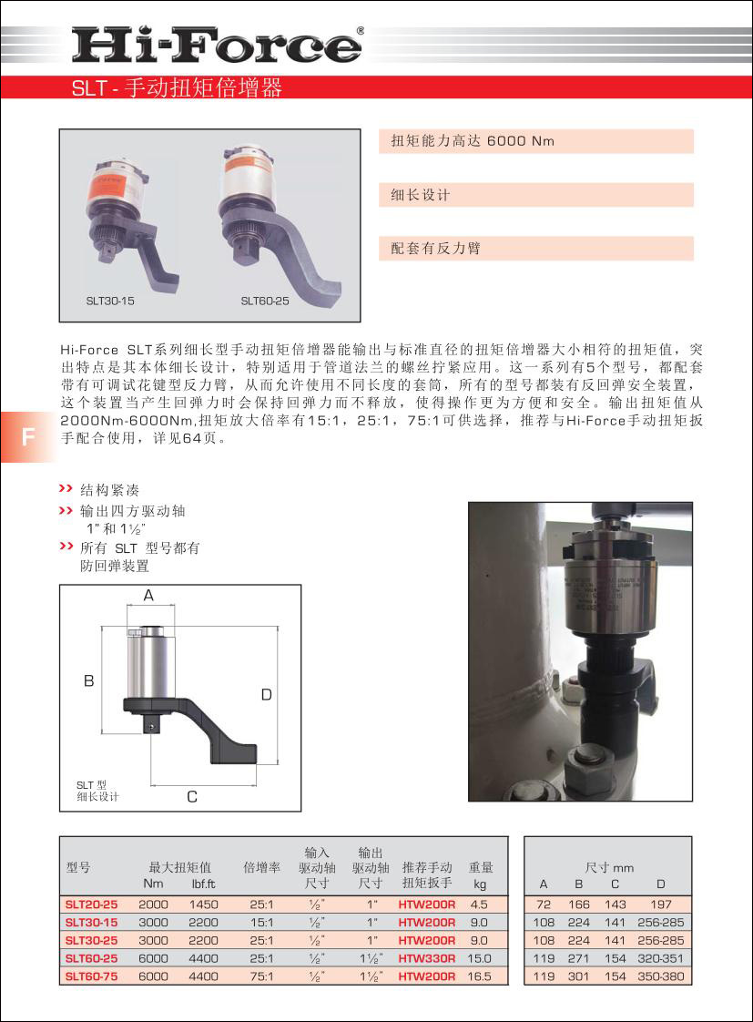這 個(gè) 裝 置 當(dāng) 產(chǎn) 生 回 彈 力 時(shí) 會(huì) 保 持 回 彈 力 而 不 釋放 , 使 得 操 作 更 為 方 便 和 安 全 。 輸 出 扭 矩 值 從2000Nm-6000Nm,扭矩放大倍率有15:1,25:1,75:1可供選擇,推薦與Hi-Force手動(dòng)扭矩扳手配合使用。