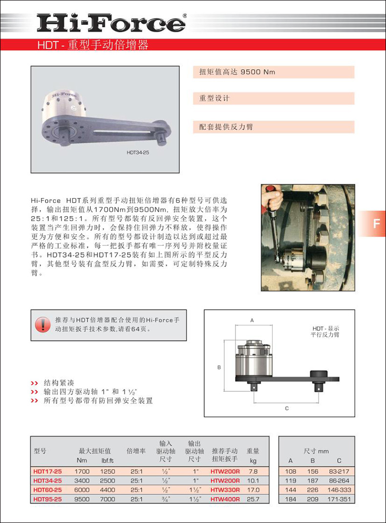 Hi-Force HDT系列重型手動(dòng)扭矩倍增器有6種型號(hào)可供選擇,輸出扭矩值從1700Nm到9500Nm, 扭矩放大倍率為25:1和125:1。所有型號(hào)都裝有反回彈安全裝置,這個(gè)裝置當(dāng)產(chǎn)生回彈力時(shí),會(huì)保持住回彈力不釋放,使得操作更為方便和安全。所有的型號(hào)都設(shè)計(jì)制造以達(dá)到或超過最嚴(yán)格的工業(yè)標(biāo)準(zhǔn),每一把扳手都有唯一序列號(hào)并附校量證書。HDT34-25和HDT17-25裝有如上圖所示的平型反力臂,其他型號(hào)裝有盒型反力臂,如需要,可定制特殊反力臂。