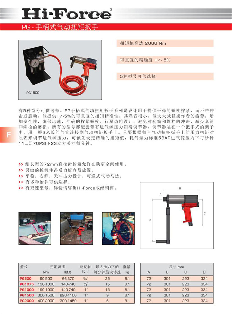 有5種型號可供選擇。PG手柄式氣動扭矩扳手系列是設(shè)計用于提供平穩(wěn)的螺栓擰緊,而不帶沖擊或震動,能提供+/-5%的可重復(fù)的扭矩精準(zhǔn)性,其噪音很小,能大大減輕操作者的疲勞,增加安全性,確保迅速,準(zhǔn)確的擰緊螺栓。行星齒輪設(shè)計,避免對套筒和螺栓的沖擊,減少套筒和螺栓的磨損。所有的型號都配套帶有進(jìn)氣源壓力潤滑調(diào)節(jié)器,調(diào)節(jié)器裝在一個把手式的架子中,用一根3米長的氣管連接到氣動扭矩扳手上。只要根據(jù)每臺氣動扭矩扳手上的壓力扭矩對照表來調(diào)節(jié)進(jìn)氣源壓力 ,可預(yù)先設(shè)定精確 的扭矩值 ,耗氣量為標(biāo)準(zhǔn)5BAR進(jìn)氣源壓力下每秒鐘11L,即70PSI下23立方英寸每分鐘。
