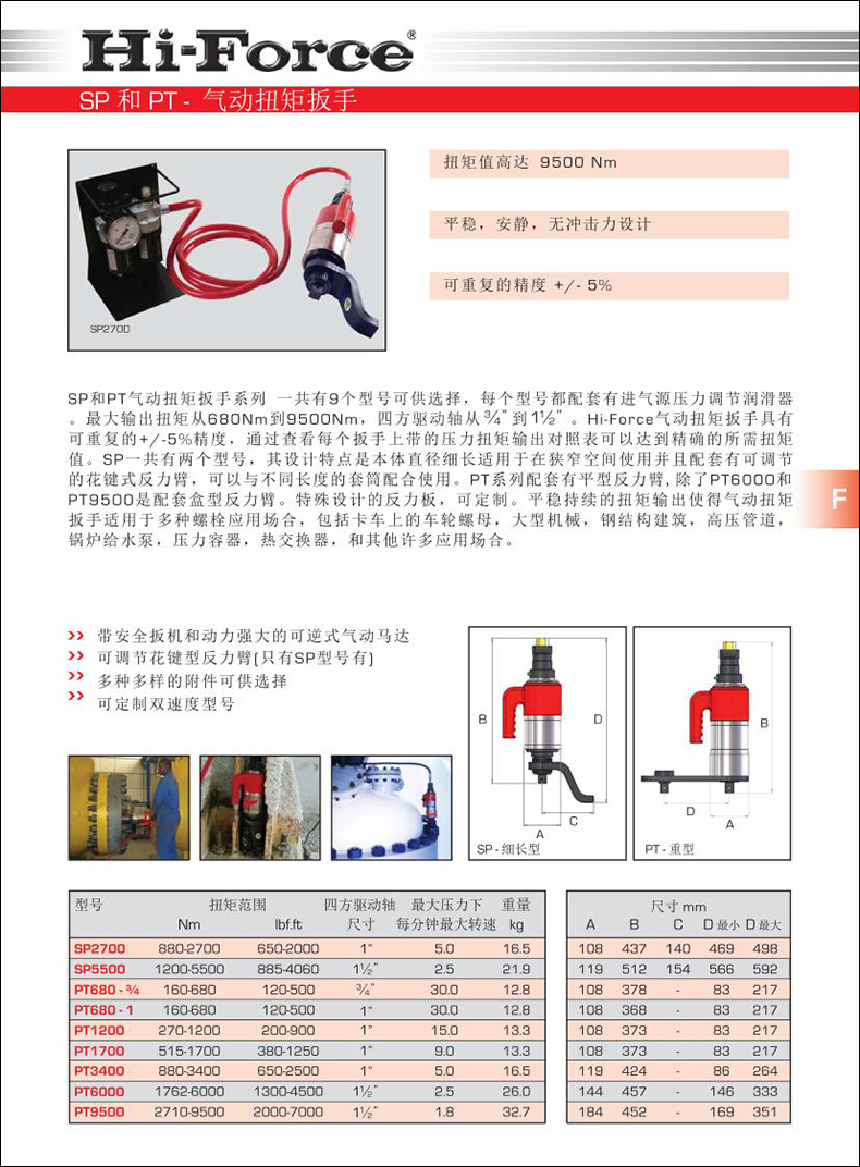 SP和PT氣動扭矩扳手系列 一共有9個型號可供選擇,每個型號都配套有進(jìn)氣源壓力調(diào)節(jié)潤滑器。超大輸出扭矩從680Nm到9500Nm,四方驅(qū)動軸從 3/4 到 1 1/2。Hi-Force氣動扭矩扳手具有可重復(fù)的+/-5%精度,通過查看每個扳手上帶的壓力扭矩輸出對照表可以達(dá)到精確的所需扭矩值。SP一共有兩個型號,其設(shè)計特點(diǎn)是本體直徑細(xì)長適用于在狹窄空間使用并且配套有可調(diào)節(jié)的花鍵式反力臂,可以與不同長度的套筒配合使用。PT系列配套有平型反力臂,除了PT6000和PT9500是配套盒型反力臂。特殊設(shè)計的反力板,可定制。平穩(wěn)持續(xù)的扭矩輸出使得氣動扭矩扳手適用于多種螺栓應(yīng)用場合,包括卡車上的車輪螺母,大型機(jī)械,鋼結(jié)構(gòu)建筑,高壓管道,