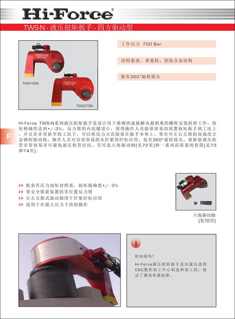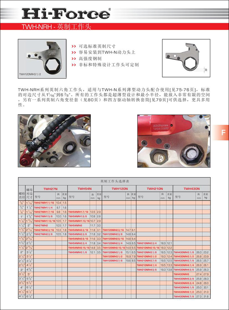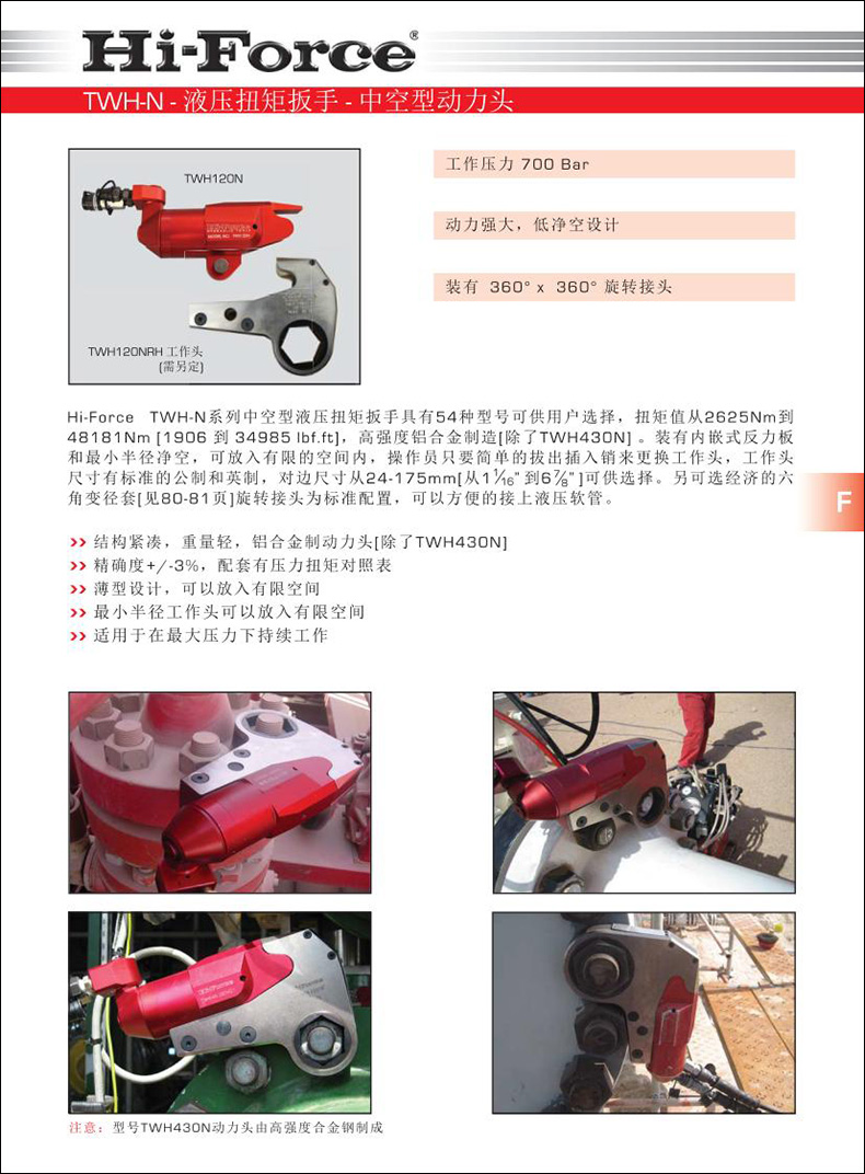 Hi-Force TWH-N系列中空型液壓扭矩扳手具有54種型號可供用戶選擇,扭矩值從2625Nm到48181Nm [1906 到 34985 lbf.ft],高強(qiáng)度鋁合金制造[除了TWH430N] 。裝有內(nèi)嵌式反力板和小半徑凈空,可放入有限的空間內(nèi),操作員只要簡單的拔出插入銷來更換工作頭,工作頭尺寸有標(biāo)準(zhǔn)的公制和英制,對邊尺寸從24-175mm[從1 1/16-6 7/8]可供選擇。另可選經(jīng)濟(jì)的六角變徑套旋轉(zhuǎn)接頭為標(biāo)準(zhǔn)配置,可以方便的接上液壓軟管。