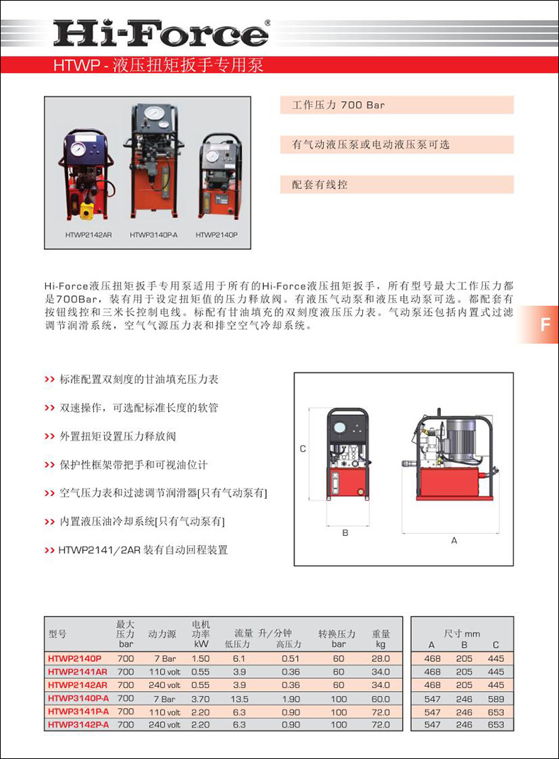 Hi-Force液壓扭矩扳手專用泵適用于所有的Hi-Force液壓扭矩扳手,所有型號工作壓力都是能達(dá)到700Bar,裝有用于設(shè)定扭矩值的壓力釋放閥。有液壓氣動泵和液壓電動泵可選。都配套有按鈕線控和三米長控制電線。標(biāo)配有甘油填充的雙刻度液壓壓力表。氣動泵還包括內(nèi)置式過濾調(diào)節(jié)潤滑系統(tǒng),空氣氣源壓力表和排空空氣冷卻系統(tǒng)。