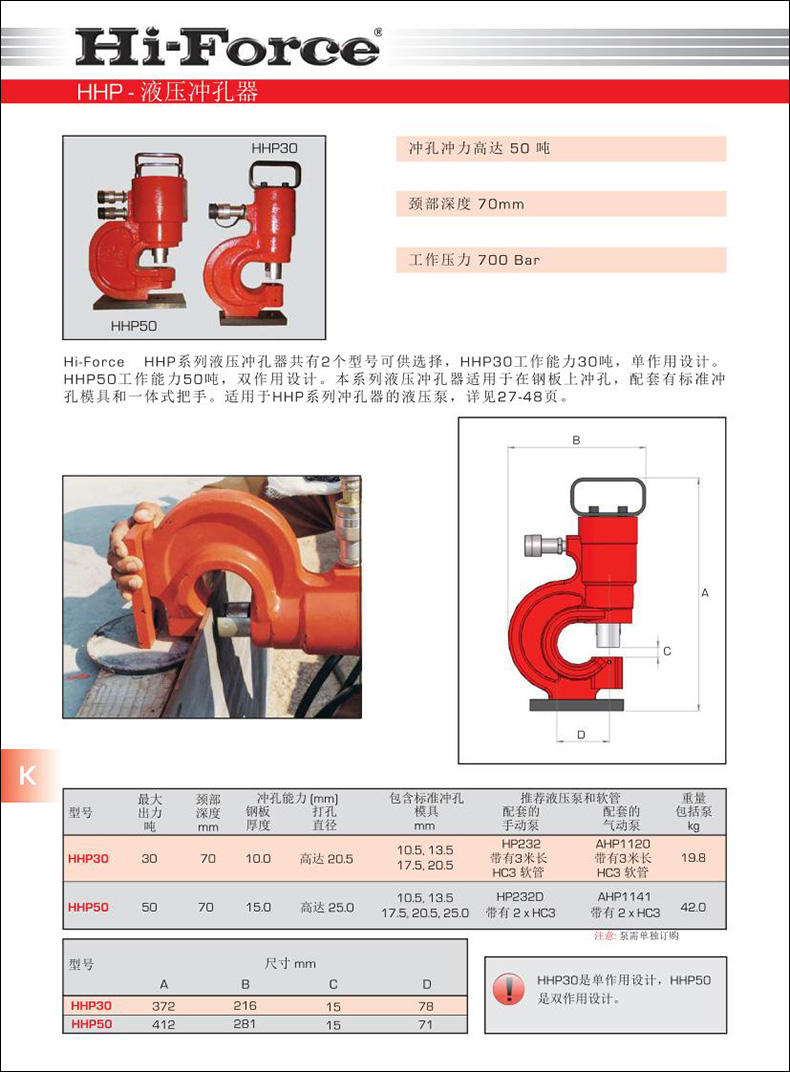 Hi-Force HHP系列液壓沖孔器共有2個(gè)型號(hào)可供選擇,HHP30工作能力30噸,單作用設(shè)計(jì)。HHP50工作能力50噸,雙作用設(shè)計(jì)。本系列液壓沖孔器適用于在鋼板上沖孔,配套有標(biāo)準(zhǔn)沖孔模具和一體式把手。