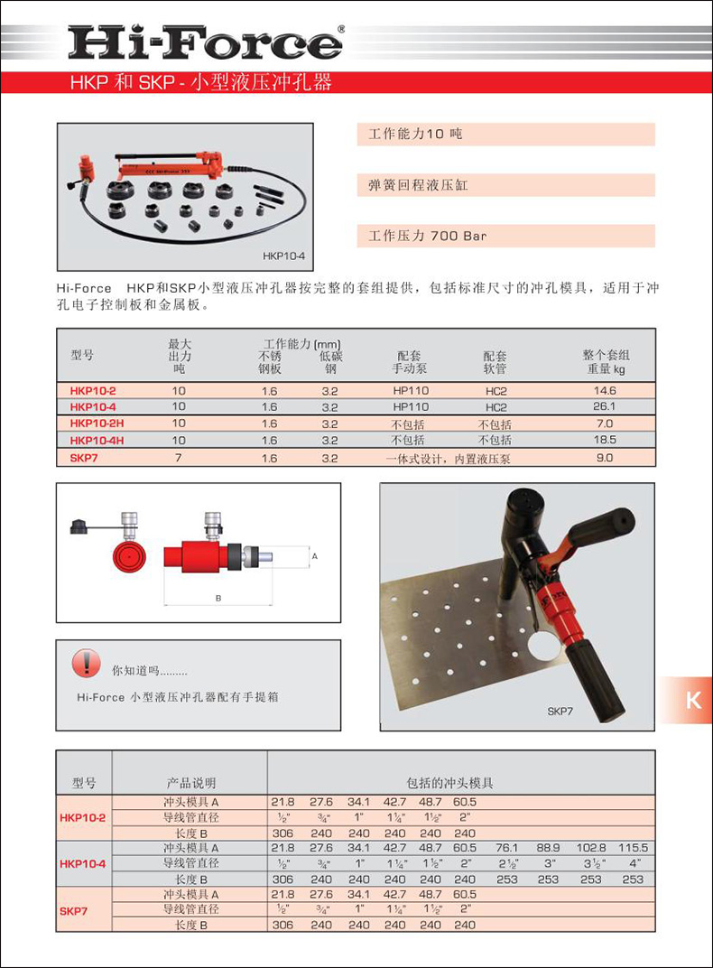 Hi-Force HKP和SKP小型液壓沖孔器按完整的套組提供,包括標(biāo)準(zhǔn)尺寸的沖孔模具,適用于沖孔電子控制板和金屬板。