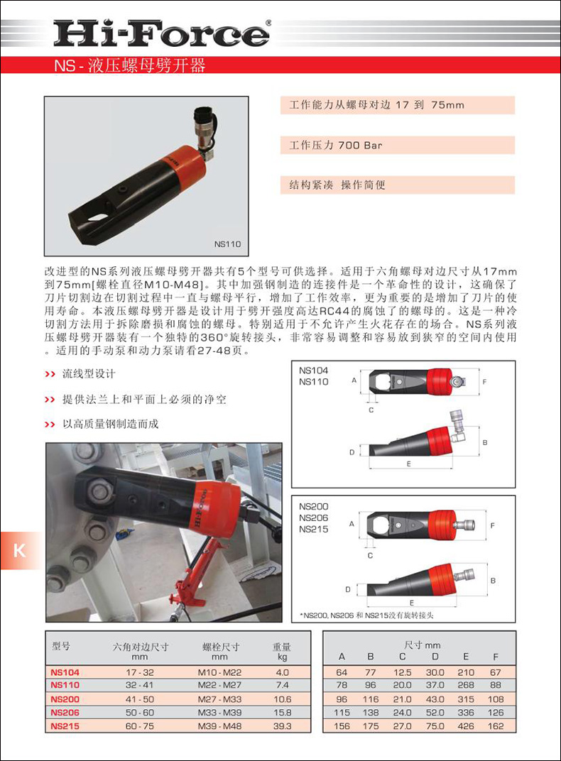 改進(jìn)型的NS系列液壓螺母劈開器共有5個(gè)型號(hào)可供選擇。適用于六角螺母對(duì)邊尺寸從17mm到75mm[螺栓直徑M10-M48]。其中加強(qiáng)鋼制造的連接件是一個(gè)革命性的設(shè)計(jì),這確保了刀片切割邊在切割過程中一直與螺母平行,增加了工作效率,更為重要的是增加了刀片的使用壽命。本液壓螺母劈開器是設(shè)計(jì)用于劈開強(qiáng)度高達(dá)RC44的腐蝕了的螺母的。這是一種冷切割方法用于拆除磨損和腐蝕的螺母。特別適用于不允許產(chǎn)生火花存在的場合。NS系列液壓螺母劈開器裝有一個(gè)獨(dú)特的360°旋轉(zhuǎn)接頭,非常容易調(diào)整和容易放到狹窄的空間內(nèi)使用。