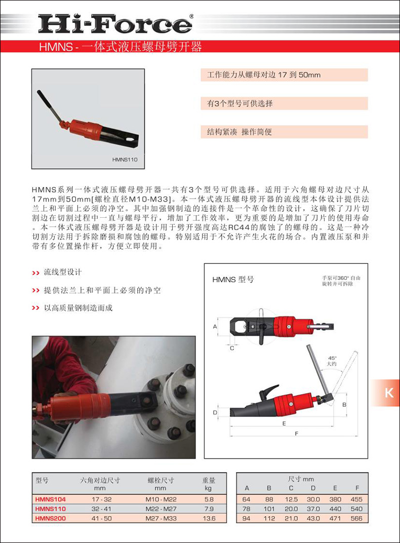 H M N S 系列一體式液壓螺母劈開器一共有3個(gè)型號(hào)可供選擇。適用于六角螺母對(duì)邊尺寸從17mm到50mm[螺栓直徑M10-M33]。本一體式液壓螺母劈開器的流線型本體設(shè)計(jì)提供法蘭上和平面上必須的凈空。其中加強(qiáng)鋼制造的連接件是一個(gè)革命性的設(shè)計(jì),這確保了刀片切割邊在切割過程中一直與螺母平行,增加了工作效率,更為重要的是增加了刀片的使用壽命。本一體式液壓螺母劈開器是設(shè)計(jì)用于劈開強(qiáng)度高達(dá)RC44的腐蝕了的螺母的。這是一種冷切割方法用于拆除磨損和腐蝕的螺母。特別適用于不允許產(chǎn)生火花的場合。內(nèi)置液壓泵和并帶有多位置操作桿,方便立即使用。