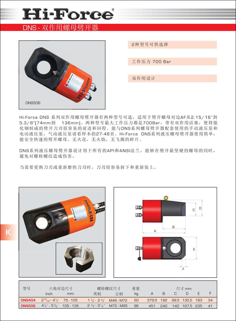 Hi-Force DNS系列雙作用螺母劈開器有兩種型號(hào)可選,適用于劈開螺母對(duì)邊AF從2.15/16”到5.3/8”[74mm到136mm]。兩種型號(hào)工作壓力都是700Bar,帶有雙作用活塞,使得強(qiáng)化鋼制成的劈開刀刃很容易的前進(jìn)和回程。能與DNS系列螺母劈開器配套使用的手動(dòng)液壓泵和電動(dòng)液壓泵,氣動(dòng)液壓泵請(qǐng)看樣本的27-48頁。Hi-Force DNS系列液壓螺母劈開器使用簡單,能安全快速的劈開螺母。無火花,無火焰,無飛濺的碎片。DNS系列液壓螺母劈開器設(shè)計(jì)用于所有的API和ANSI法蘭,能夠在劈開堅(jiān)硬的螺母的同時(shí),避免對(duì)螺栓螺紋造成傷害。當(dāng)需要更換刀刃或重新磨快刀刃時(shí),刀刃很容易拆下和重新裝上。