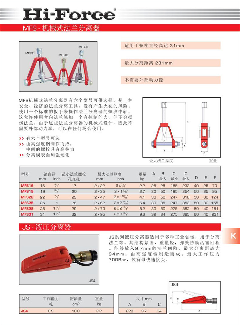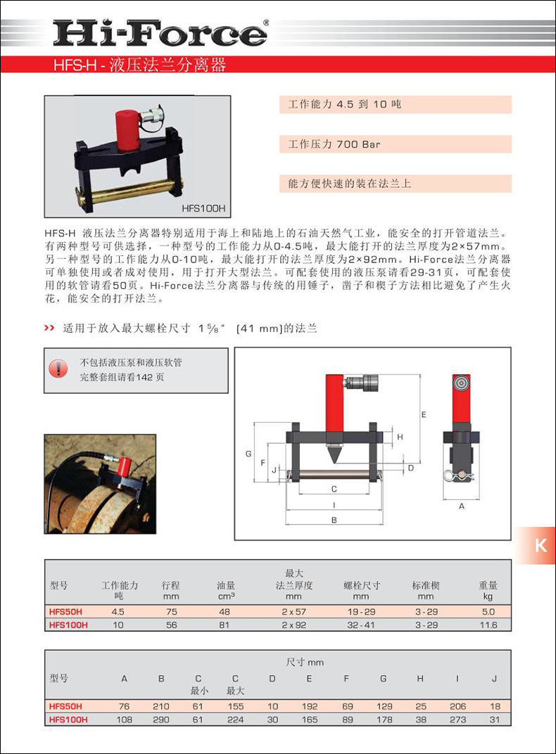 HFS-H 液壓法蘭分離器特別適用于海上和陸地上的石油天然氣工業(yè),能安全的打開管道法蘭。有兩種型號可供選擇,一種型號的工作能力從0-4.5噸,上限能打開的法蘭厚度為2×57mm。另一種型號的工作能力從0 - 10噸,上限能打開的法蘭厚度為2×92mm 。Hi-Force法蘭分離器可單獨(dú)使用或者成對使用,用于打開大型法蘭?膳涮资褂玫能浌苷埧50頁。Hi-Force法蘭分離器與傳統(tǒng)的用錘子,鑿子和楔子方法相比避免了產(chǎn)生火花,能安全的打開法蘭。
