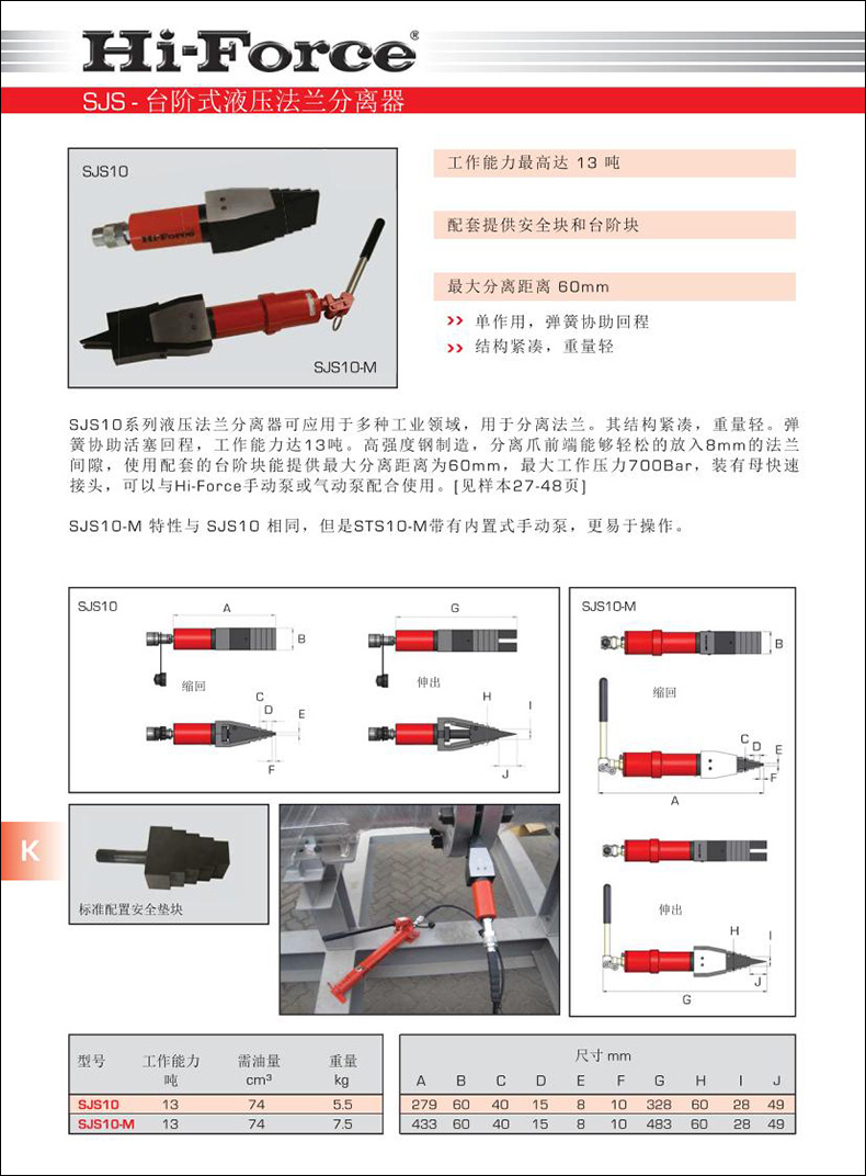 SJS10系列液壓法蘭分離器可應(yīng)用于多種工業(yè)領(lǐng)域,用于分離法蘭。其結(jié)構(gòu)緊湊,重量輕。彈簧協(xié)助活塞回程,工作能力達(dá)13噸 。高強(qiáng)度鋼制 造,分離爪前端能夠輕松的放入8mm的法蘭間隙,使用配套的臺階塊能提 供最大分離距離為60mm,工作壓力700Bar,裝有快速接頭。