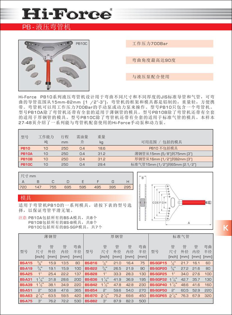 Hi-Force PB10系列液壓彎管機(jī)設(shè)計用于彎曲不同尺寸和不同厚度的JIS標(biāo)準(zhǔn)導(dǎo)管和氣管,可彎曲的導(dǎo)管范圍從15mm-82mm [1/2”-3”],彎管機(jī)的框架和模具都是鋁制的,重量輕,方便攜帶。彎管機(jī)可以用工作壓力700Bar的手動泵或動力泵來操作。型號PB10只包含一個彎管機(jī)。型號PB10A除了彎管機(jī)還帶有全套的適用于薄鋼管的模具。型號PB10B除了彎管機(jī)還帶有全套的適用于厚鋼管的模具。型號PB10C除了彎管機(jī)還帶有全套的適用于標(biāo)準(zhǔn)氣管的模具。